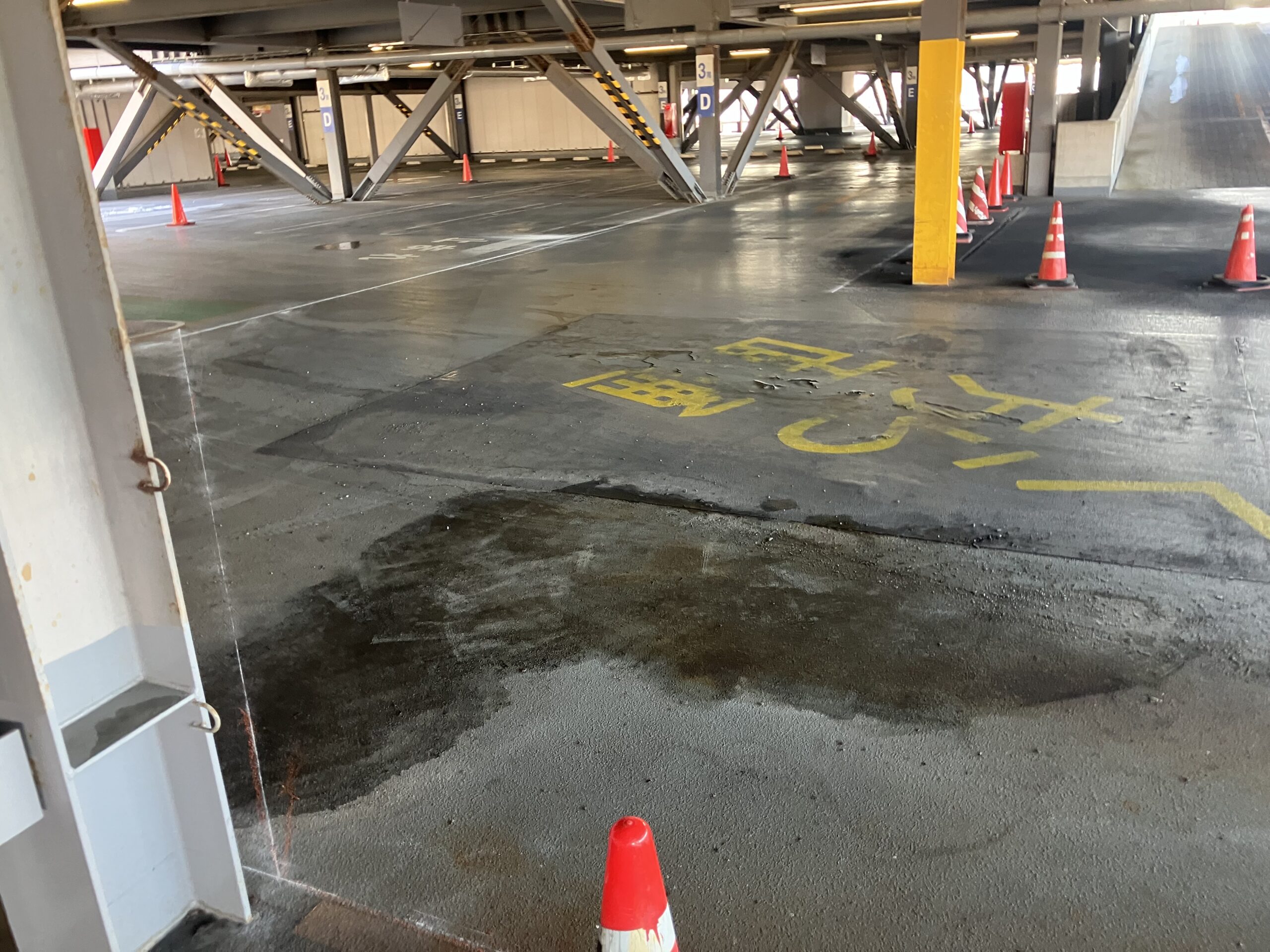 立体駐車場では、特にスロープの旋回部において、車両のハンドル操作によるねじれや摩耗、重量負荷が集中し、防水層にとって非常に過酷な条件となります。